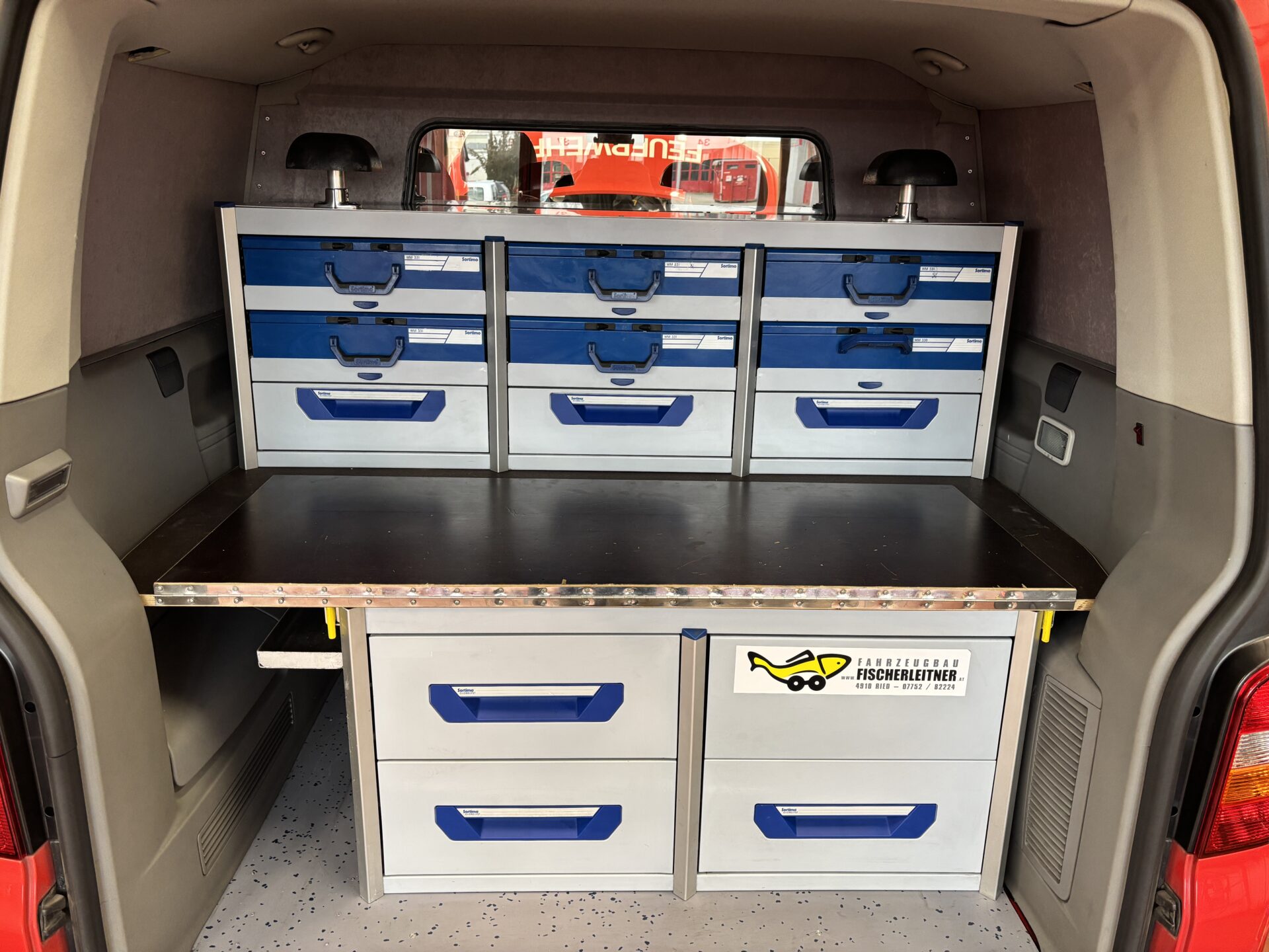 Im Heck des Fahrzeuges ist ein Regalsystem von Sortimo mit Sortimo-Koffer verbaut. Zeitgleich ist dieser auch ein Arbeitstisch, der eine erweiterbare ausklappbare Tischfläche hat.